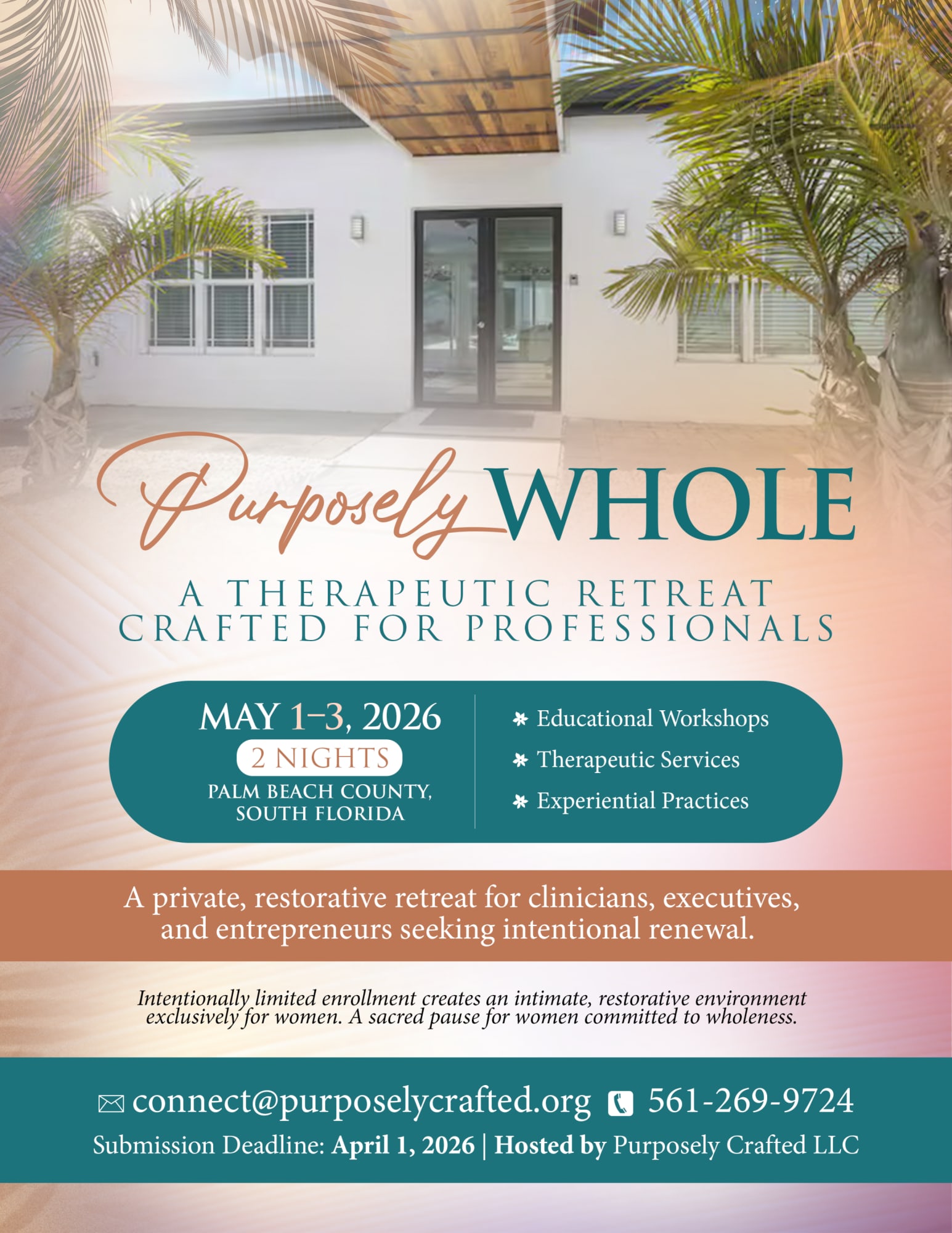 Purposely Whole is the first intimate therapeutic retreat of its kind. Thoughtfully curated, we’re hosting a 2-night professional women’s retreat in Westlake, FL, from May 1–3.